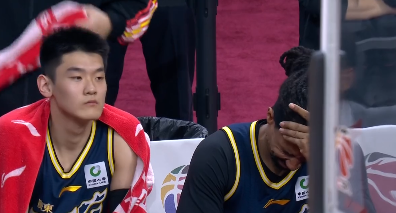 比赛第二节初段,萨林杰在一次中投不进后的回防过程中,疑似出现了伤情,萨林杰蹲在底线附近,不断向场边教练组比划要换人的手势。